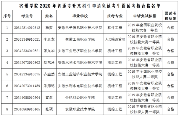 根据《大赢家体育2020年普通专升本招生章程》,经考生本人自愿申请,我校招生工作组审核,杨爽等15位考生的免试申请符合我校普通专升本招生章程规定的免试基本条件。后经面试专家小组面试考核,杨爽等8位考生的面试考核合格,现将面试考核合格考生名单予以公示。