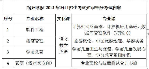 考试内容为“知识+技能”,以教育部颁布的现行教学大纲及专业教学标准为依据。其中,文化课考试内容参照全省统一的《安徽省普通高校分类考试招生和对口招生文化素质测试考试纲要》;专业理论考试及技能测试内容参考《安徽省普通高校对口招生专业理论和技能测试考试纲要(2021年版)》。