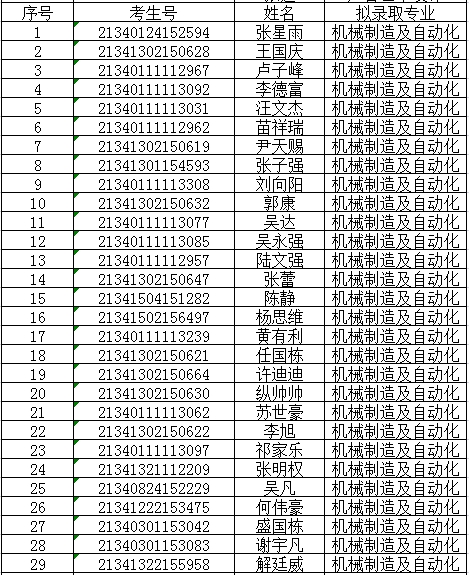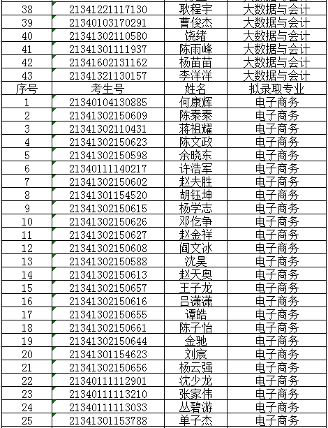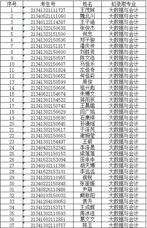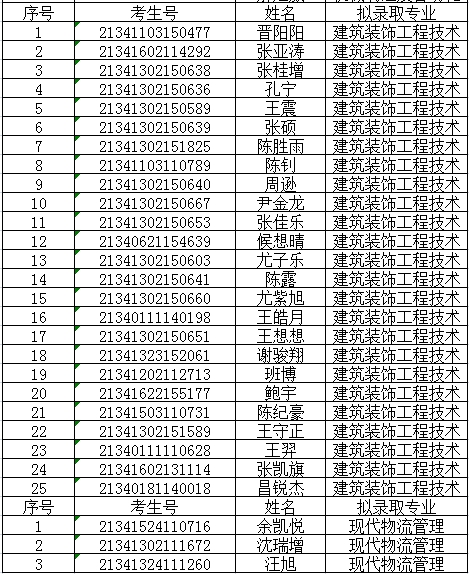 现对预录取考生名单进行公示,公示时间5月1日—5月8日,如有异议,请于5月8日17:00前以书面形式反馈到大赢家体育招生就业处(联系电话:0557-2875361,传真:0557-2875360),也可直接向大赢家体育纪委办公室(监察专员办公室)反馈(电话:0557-2875950)。预录取名单如下: