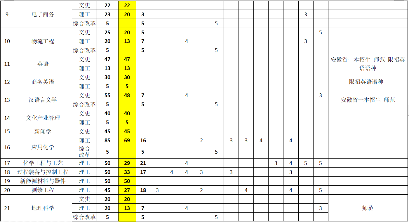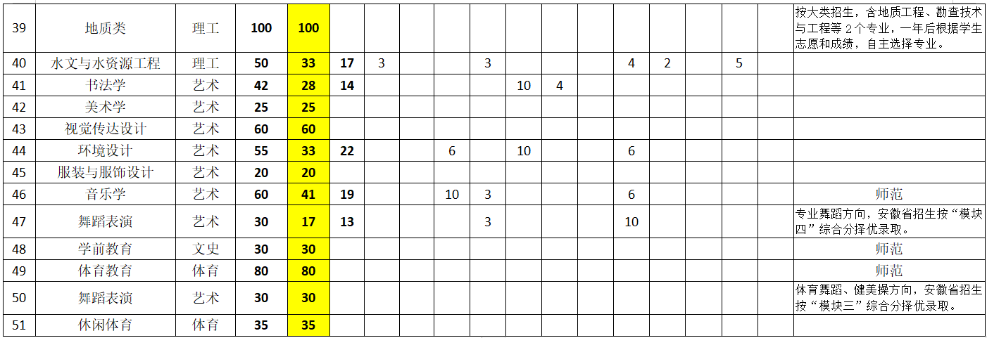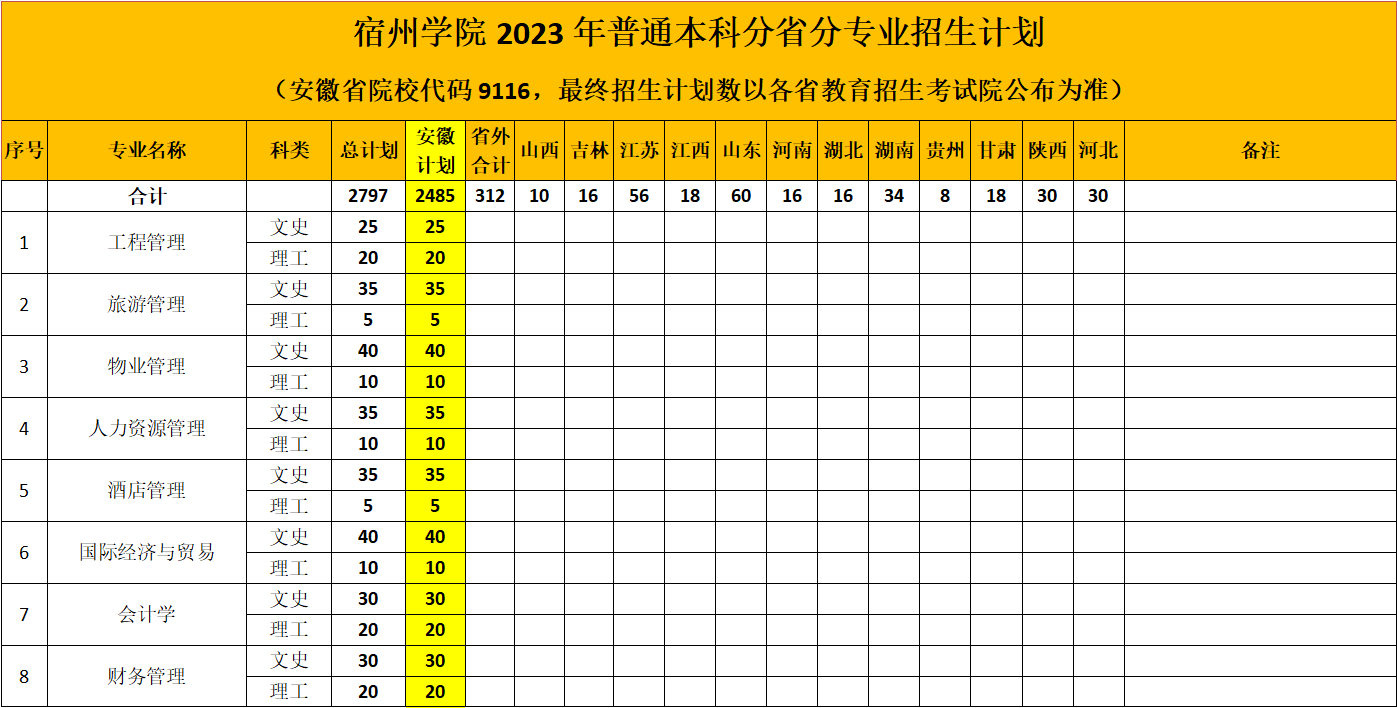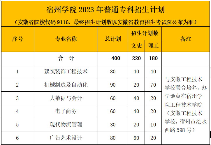 2023年,我校普通本专科招生计划建议数为4362。其中,本科招生计划3867,按生源地分,省内计划2485,省外计划312;按招生类别分,普通高考招生计划2797,对口本科计划270,普通专升本计划800。专科招生计划495(其中普通高考招生计划400,分类招生计划95),与安徽工程技术学校联合培养,办学地址在大赢家体育工程技术学院(安徽工程技术学校,宿州市浍水西路598号)。